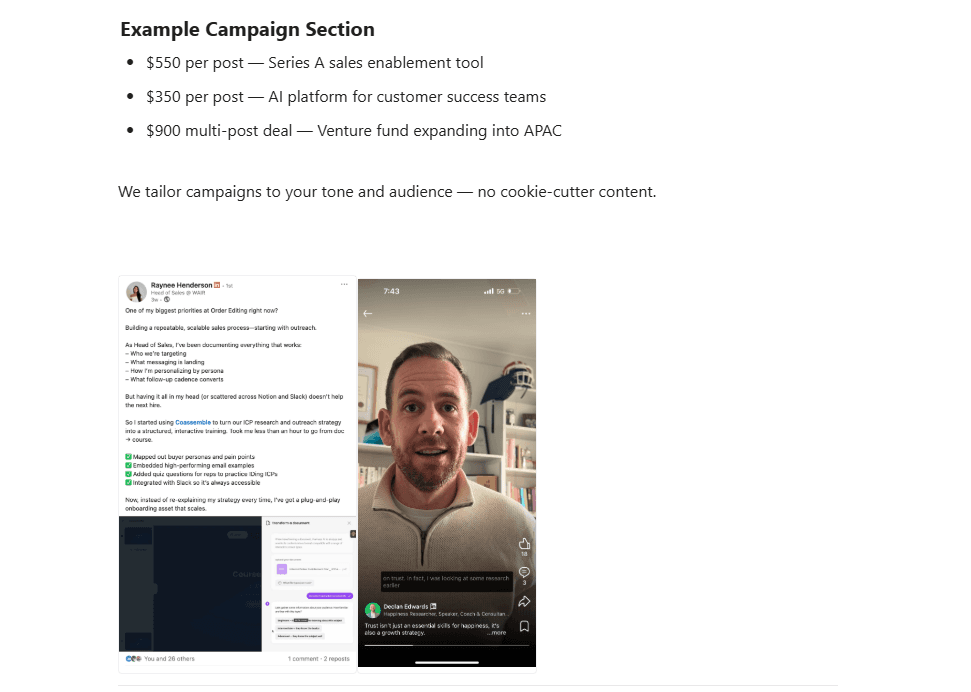 When a trusted creator or brand puts their name next to yours, your message gains instant credibility- and reaches buyers who already trust the messenger.